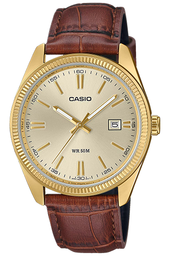 CASIO MTP-1302PGL-9AV. Resistencia al agua hasta una profundidad de 5 bares, Visualización de fecha a las 3 en punto, Un diseño sencillo y fácil de usar, Correa de cuero auténtico.