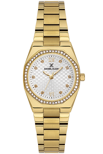 Reloj analógico para mujer DANIEL KLEIN DK-14099-3, Con esfera y caja dorada con bisel decorado y correa de acero dorada. 28 mm.