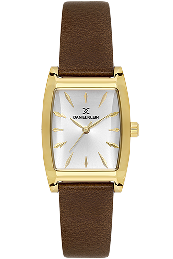 DANIEL KLEIN DK-14120-3. Reloj analógico para mujer de diseño rectangular de 23 × 33mm. Cuenta con una esfera plateada con acabado rayos de sol, una caja de acero dorada y una elegante correa de piel marrón. Equipado con un fiable movimiento de cuarzo japonés.