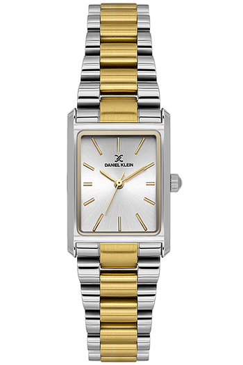 DANIEL KLEIN DK-14123-4. Reloj analógico para mujer de diseño rectangular de 22 × 32mm. Cuenta con una esfera plateada, una caja de acero rectangular del mismo color y una elegante correa de acero bicolor. Equipado con un fiable movimiento de cuarzo japonés.