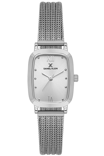 DANIEL KLEIN DK-14125-1. Reloj analógico para mujer de diseño rectangular de 22mm. Cuenta con una esfera plateada, una caja de acero rectangular y una elegante correa de malla de acero plateada. Equipado con un fiable movimiento de cuarzo japonés.