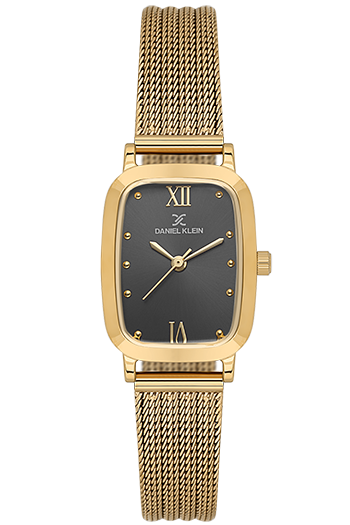 DANIEL KLEIN DK-14125-2. Reloj analógico para mujer de diseño rectangular de 22mm. Cuenta con una esfera negra, una caja de acero rectangular y una elegante correa de malla de acero dorada. Equipado con un fiable movimiento de cuarzo japonés.