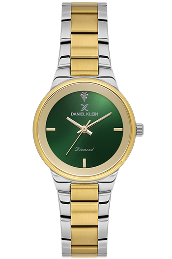 DANIEL KLEIN DK-14136-4. Reloj analógico para mujer de 35mm. Cuenta con una esfera verde, una caja de acero con bisel dorado y una elegante correa de acero bicolor. Equipado con un fiable movimiento de cuarzo japonés.