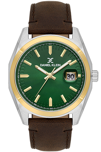 DANIEL KLEIN DK-14138-3. Reloj analógico para hombre. Cuenta con una esfera verde con fecha, una caja de acero de 42mm con un bisel dorado y una elegante correa de piel marrón. Equipado con un fiable movimiento de cuarzo japonés.