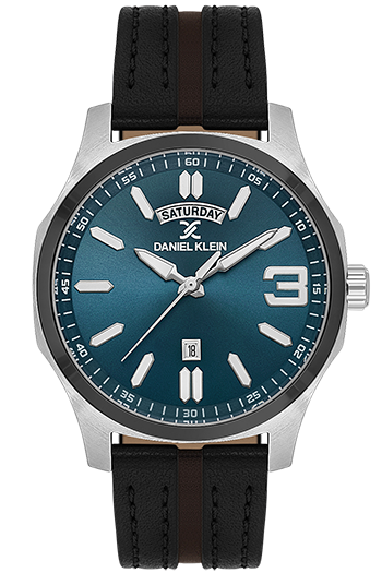 DANIEL KLEIN DK-14141-4. Reloj analógico para hombre. Cuenta con una esfera azul con fecha, una caja de acero de 43mm con un bisel gris y una elegante correa de piel negra. Equipado con un fiable movimiento de cuarzo japonés.