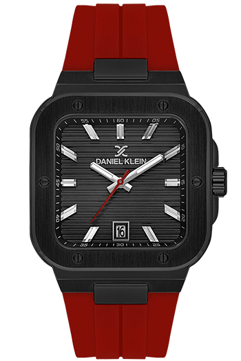 DANIEL KLEIN DK-14141-6. Reloj analógico para hombre. Cuenta con una esfera roja con fecha, una caja cuadrada de acero de 39mm y una correa de silicona roja. Equipado con un fiable movimiento de cuarzo japonés.
