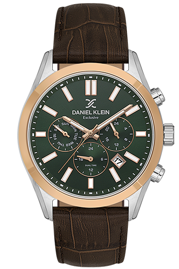 DANIEL KLEIN DK-14212-4. Reloj multifunción para hombre. Cuenta con una esfera verde con tres sub-esferas, una caja plateada de acero de 44 mm con un bisel oro rosa y una elegante correa de piel marrón. Equipado con un fiable movimiento de cuarzo japonés.