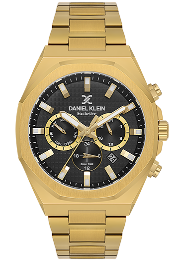 DANIEL KLEIN DK-14218-4. Reloj multifunción. Cuenta con una esfera negra con tres sub-esferas, una caja de acero de 43 mm y una elegante correa de acero dorada. Su movimiento de cuarzo japonés y su resistencia al agua hasta 50 metros lo convierten en el complemento perfecto para el día a día.