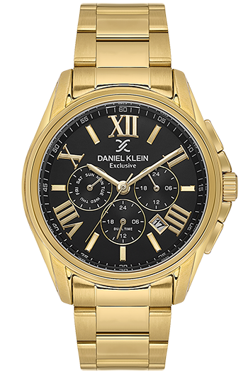 DANIEL KLEIN DK-14222-5. Reloj multifunción. Cuenta con una esfera negra con tres sub-esferas, una caja de acero de 43 mm y una elegante correa de acero dorada. Su movimiento de cuarzo japonés y su resistencia al agua hasta 50 metros lo convierten en el complemento perfecto para el día a día.