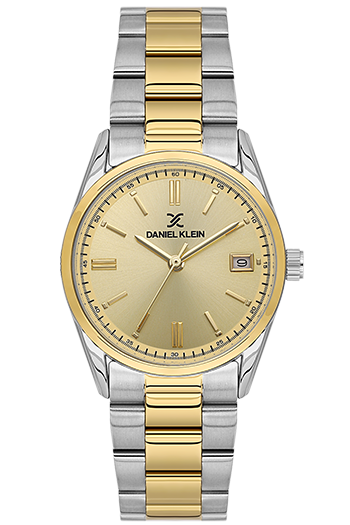 DANIEL KLEIN DK-14133-4. Reloj analógico para mujer. Cuenta con una esfera dorada con fecha, una caja de acero de 30mm y una elegante correa de acero bicolor. Equipado con un fiable movimiento de cuarzo japonés.