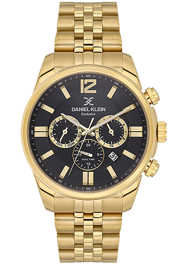 DANIEL KLEIN DK-14232-5. Esfera negra con acabado rayos de sol, indicador de fecha y correa de acero inoxidable dorada. Su caja de aleación dorada de 43mm, su movimiento de cuarzo japonés y su resistencia al agua hasta 50 metros lo convierten en el complemento perfecto para el día a día.