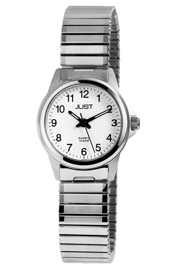 Reloj JUST WATCH para señora. Con caja de acero de 27 mm de diámetro, esfera analógica de tres agujas y correa plateada de acero extensible. 10 ATM
