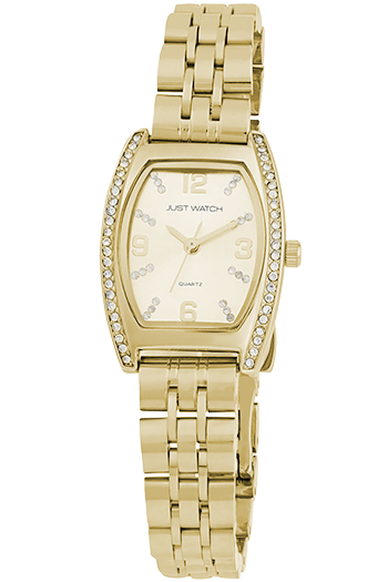 Reloj de mujer Akadia de JUST WATCH, con su exclusiva caja de forma tonneau, adornada en los laterales con brillantes piedras de imitación. La esfera combina números arábigos con piedras de imitación como índices de barra, lo que le da a este reloj un toque especial.