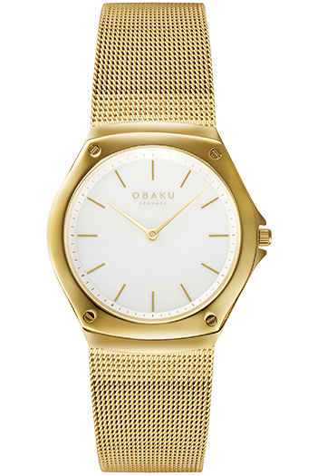 OBAKU LAGEN LILLE GOLD V316LXGWMG. Con un grosor inferior a 5 mm, combina la elegancia del minimalismo escandinavo con un detalle de diseño atrevido, cuatro tornillos refinados en el anillo superior. Protegida por un cristal de zafiro y un brazalete de malla de acero inoxidable