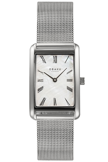 Obaku LINDE Steel V311LXCWMC. Combina la sofisticación atemporal con el minimalismo escandinavo moderno. Caja rectangular de 24 x 37 mm, fabricada en acero inoxidable y esfera de nácar auténtico, adornada con 12 números romanos estilizados en una disposición refinada completan el look.