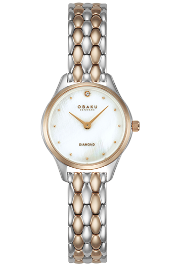 Obaku Smykke Petite Cherrywood V297SXZWSH. Este reloj bicolor de 24 mm presenta una esfera blanca de nácar con un diamante de talla única SI1 de origen responsable a las 12 en punto. Los detalles en oro rosa en el bisel superior, los eslabones centrales y las agujas contrastan con la caja de acero.